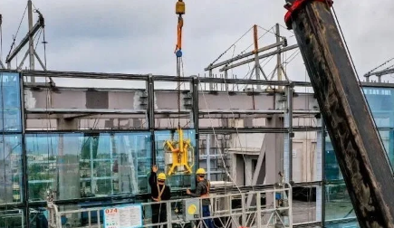在海口江東玖龍總部項目現(xiàn)場, 施工人員正在安裝整體玻璃幕墻和整體鋁龍骨,當(dāng)高空升降車把玻璃吊裝到工人附近時,工人再緩緩拉動手拉葫蘆的鏈條,確保幕墻玻璃能精準的落入到指定位置,使玻璃幕墻單元板塊慢慢靠近安裝區(qū)域的結(jié)構(gòu)面處,同時樓層安裝工根據(jù)玻璃幕墻單元板塊的位置指揮控制活動吊機的操作人員運行活動吊機將玻璃幕墻單元板塊吊到安裝位置,從而保證玻璃幕墻單元模塊在吊裝過程中的穩(wěn)定性,便于安裝人員對其進行控制。